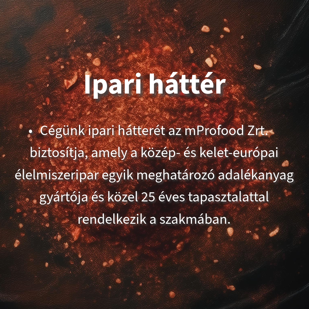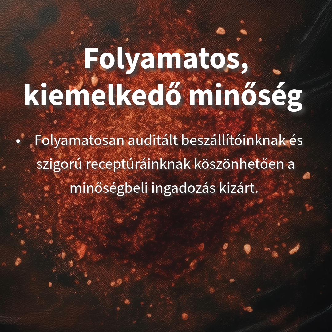 Magyarország legnagyobb ipari fűszerkeverék-gyártójának kizárólagos partnere vagyunk, melyből adódóan termékeink minősége jelentősen jobb, mint legtöbb versenytársunké. Beszállítóinkat folyamatosan auditáljuk, alapanyag beszerzésnél elsődleges szempont a minőség, de a költséghatékony felhasználás szem előtt tartásával.